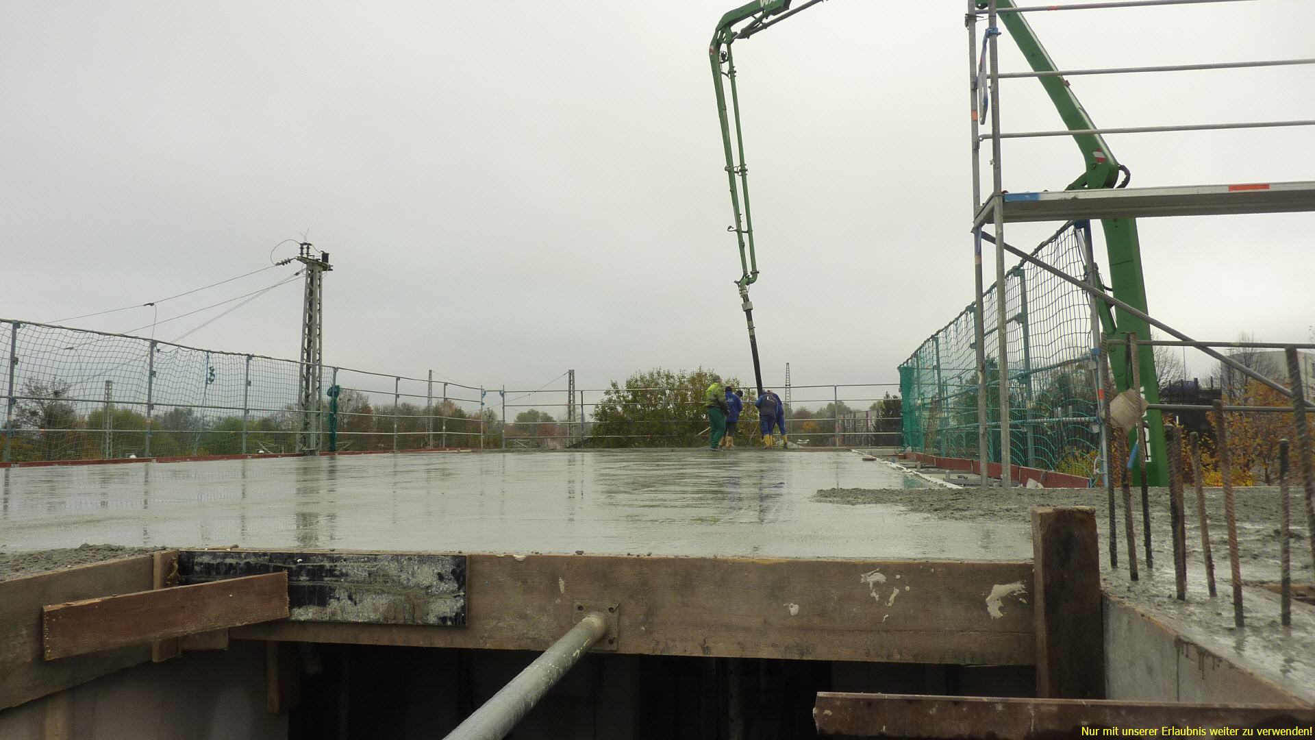 04.11.2014 - Die EG-Decke ist mit den GroßflächenPlattenDecke eingeschalt, der Stahl verlegt und der Prüfstatiker hat die Bewehrung abgenommen. Die Decke wird betoniert. |